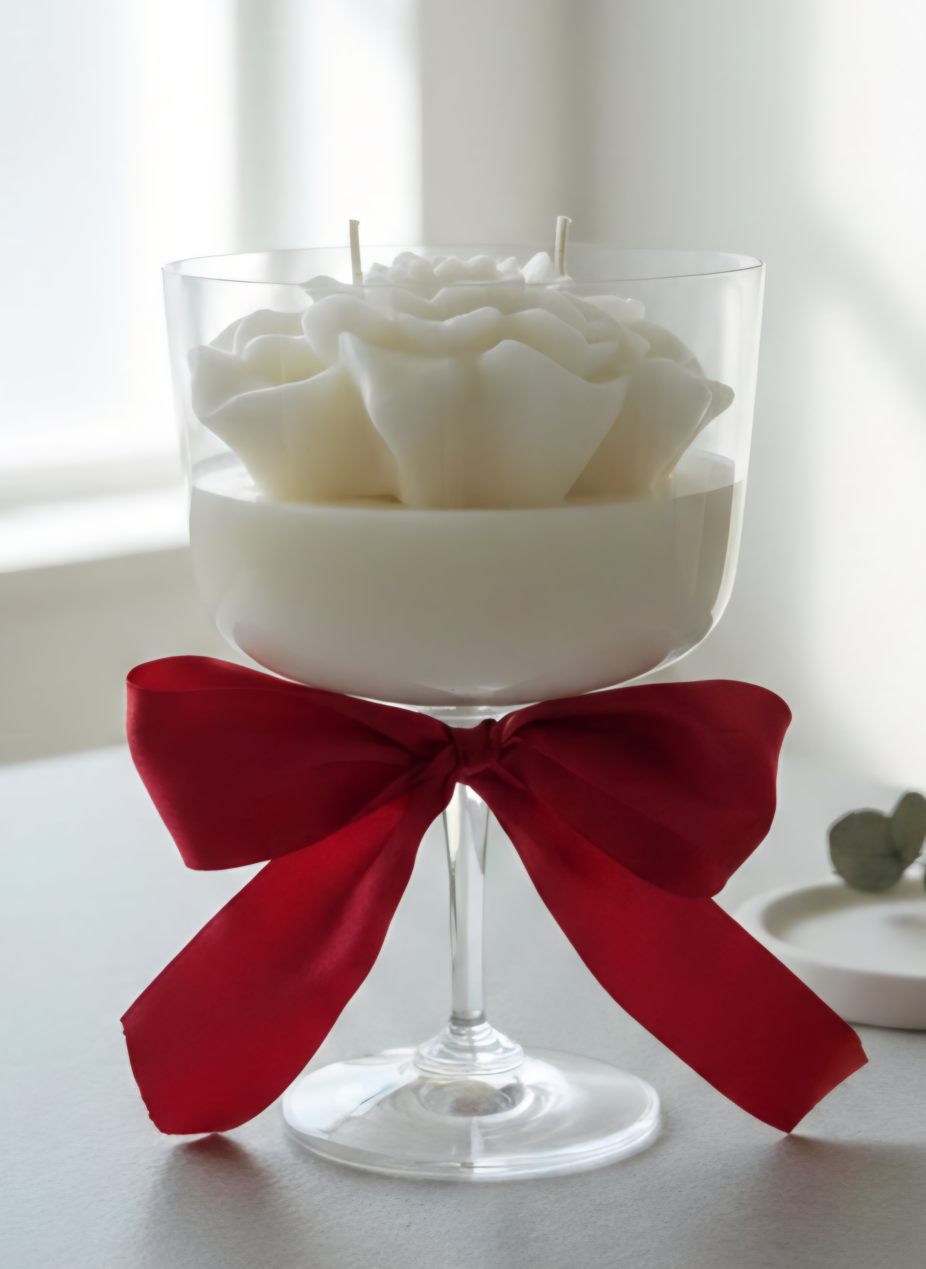 Dankzij het unieke ontwerp in een chic champagneglas en de prachtig gedetailleerde witte wasroos in het midden, is deze kaars de perfecte centerpiece (tafeldecoratie). Of het nu gaat om een bruiloft, een chic diner of een luxe cadeau, de Royal Ivory Centerpiece is een echte blikvanger die elke tafel onmiddellijk transformeert. De dieprode fluwelen strik voegt een klassiek accent van passie en luxe toe.